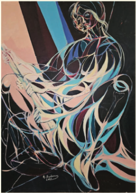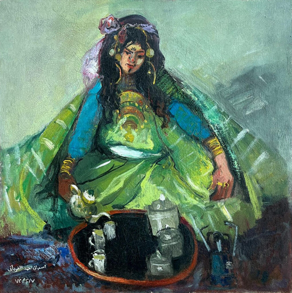 Another of Elfergani’s painting in the BAF’s collection captures a quiet, everyday ritual. The Libyan Women (1972) depicts a figure wearing a traditional garment, her face adorned with intricate facial tattoos, seated cross-legged as she pours tea using an e’dala—the traditional tea set used in tea-making ceremonies. Her body leans gently forward, gaze cast downward, and arms gracefully extended, forming a compelling triangular composition. The gesture is intimate and familiar, rendered with loose yet deliberate brushwork. The scene is richly colored: the glittering yellow of her gold jewelry, the bright green of her striped ḥrām, and bursts of blue and purple in the patterned carpet all enliven the space. These vivid elements are set against a background of muted teal and sage green tones, reminiscent of the ones used in the portrait mentioned above, maintaining visual consistency despite the 12-year gap between the two pieces. Elfergani neither exoticizes nor monumentalizes the scene; instead, she presents the act of tea-making as a quiet assertion of presence. The intimacy of the gesture, framed by a stable triangular composition, enacts what Pollock terms a “feminist intervention”22 in representation, by placing care and ritual at the aesthetic center.