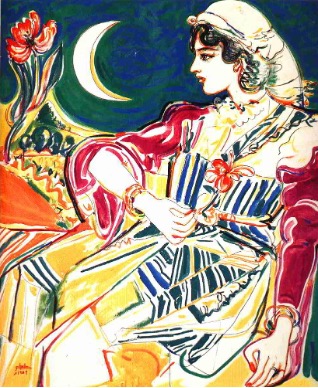 Against this backdrop of shifting aesthetics and constrained expression, artists navigated representations of culture and identity in different ways. Works that addressed culture typically consisted of nostalgic scenes of the old city, still lifes, or portraits. Representations of tradition are often anchored in public space, as seen in the works of Awad Obaida (1923 – 2014), where the city’s architecture, landscape, and communal life take center stage. Women, in these narratives, are frequently portrayed either symbolically or as vessels of heritage, their traditional garments bearing the weight of identity. Even when positioned as central subjects, their representation remains largely allegorical. For instance, the painting of a lady and a crescent moon in the background (1989) and the painting of a reclining woman (c. 1970s) by Al Taher Al Amin El Moghrabi (1941 – 2017) exemplify this tendency—foregrounding the female figure while encoding her within a broader national or folkloric framework. Nevertheless, intimate depictions of women performing domestic tasks continue to appear in the works of artists like Mohamad Esteita (1936–2005), Ahmed Bodera’a (1944-2014), and in portrayals of private traditional ceremonies, as seen in The Bride (date unknown) by Ramadan Bakshishi (1938–2024). Despite each artist’s vastly different techniques and styles, these representations often remain somewhat distant and external, focusing more on broader artistic themes such as space, movement, and the formal qualities of the composition rather than offering a deeper engagement with the female subject.