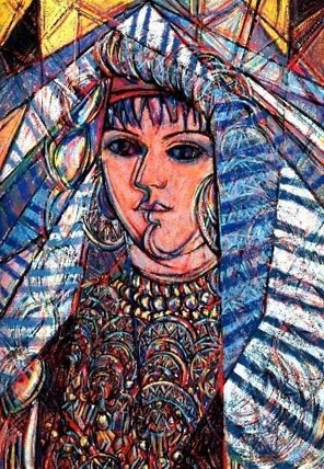 Elfergani’s subjects, by contrast, appear quietly self-defined. The Libyan Lady (1976) stands out as Asmahan’s most famous work. The painting explores identity with emotional nuance, depicting a dark-skinned woman with black hair, wearing a bright green ḥrām arranged atop her head into a triangular shape. Bold yellow strokes accentuate her intricate jewelry, contrasting with the finely rendered reflective earring. Her chin tilts gently downward, while her eyes glance upward, meeting the viewer’s gaze with a subtle, quietly assured glance. The brown back ground deepens the chromatic contrast, further accentuating her features. In composition, it bears resemblance to Bashir Hammouda’s (b. 1948) untitled vivid portrayal of a woman. However, where Hammouda employs geometric abstraction and plays with light and spatial construction, Asmahan privileges psychological presence over formal experimentation. The Libyan Lady diverges from more distant, iconic, symbolic, or folkloric treatments of women due to the emotional depth it bears.